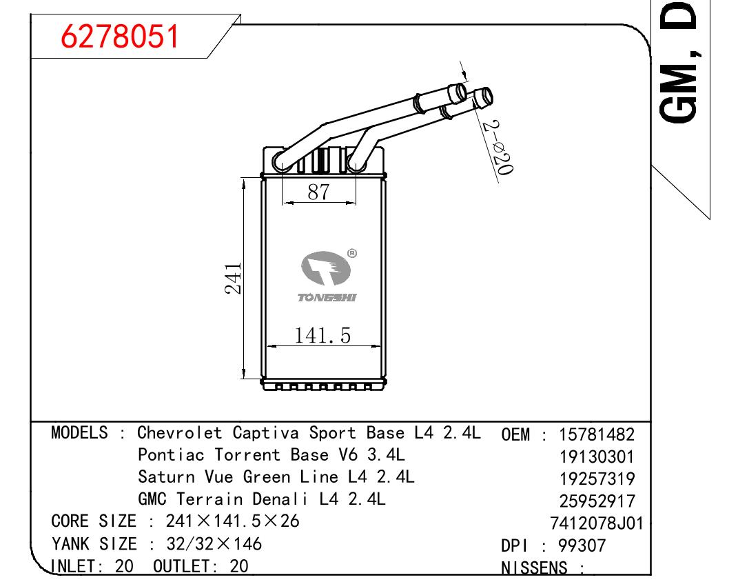 适用于雪佛兰Captiva Sport Base L4 2.4L/庞蒂克 Torrent Base V6 3.4L/土星 Vue Green Line L4 2.4L暖风
