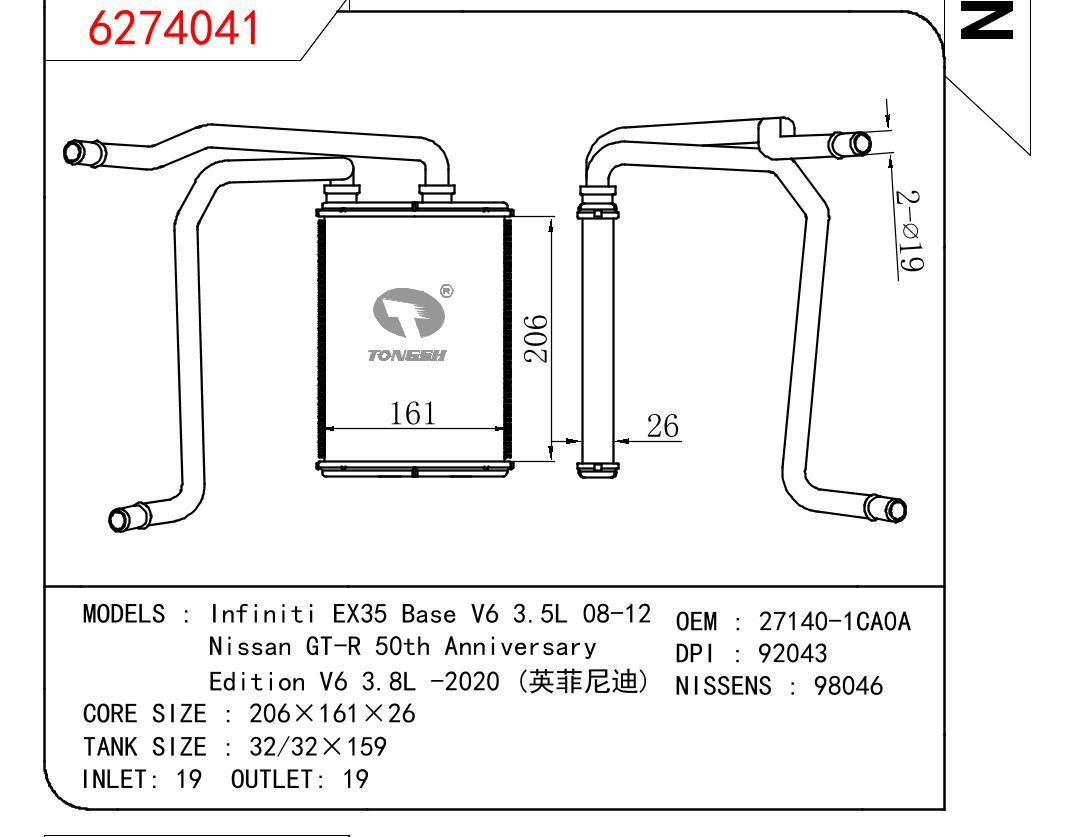 适用于英菲尼迪EX35 Base V6 3.5L 08-12/Nissan GT-R 50th Anniversary/Edition V6 3.8L -2020暖风OEM : 27140-1CA0A