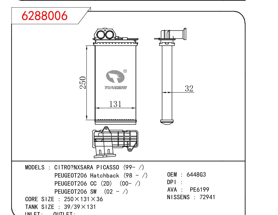 适用于CITRO?NXSARA PICASSO (99- /)/标致206 掀背车 (98 - /)/206 CC (2D) (00- /)/206 SW (02 - /)暖风OEM : 6448G3