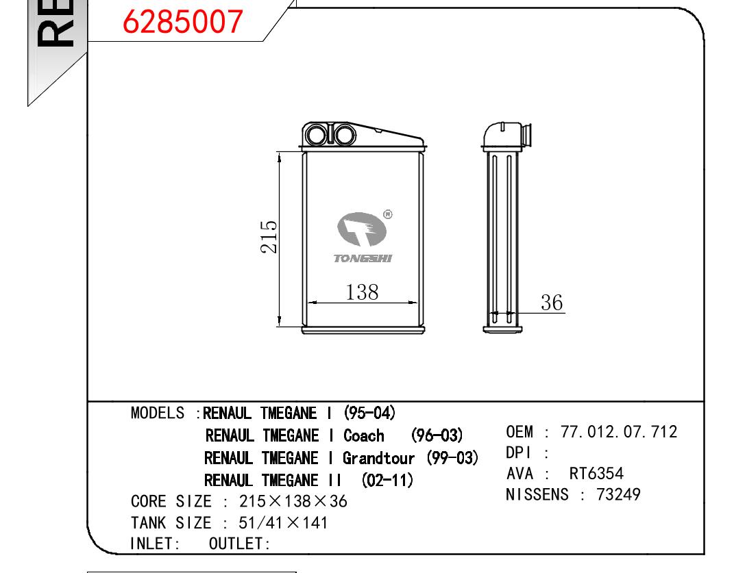适用于雷诺MEGANE I 95-04/ I COACH 96-03/ I GRANDTOUR 99-03/ II 02-11暖风 OEM : 77.012.07.712