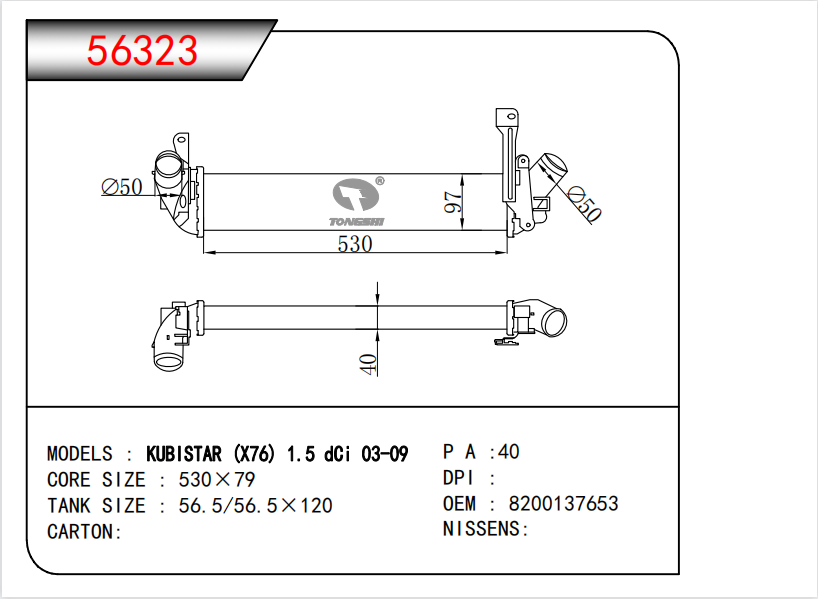 适用于尼桑KUBISTAR (X76) 1.5 dCi 03-09/ KUBISTAR Box (X80) 1.5 dCi 03-10中冷器 OEM:8200137653/82 00 221 885/8200732390
